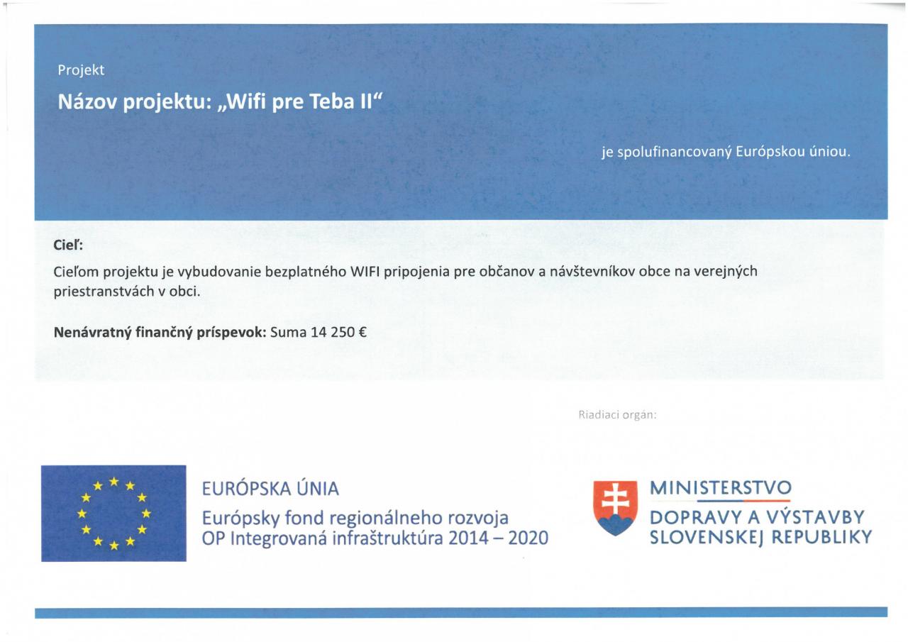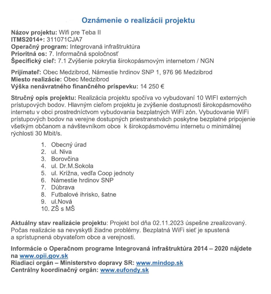 Wifi pre Teba II. - oznámenie o realizácii projektu